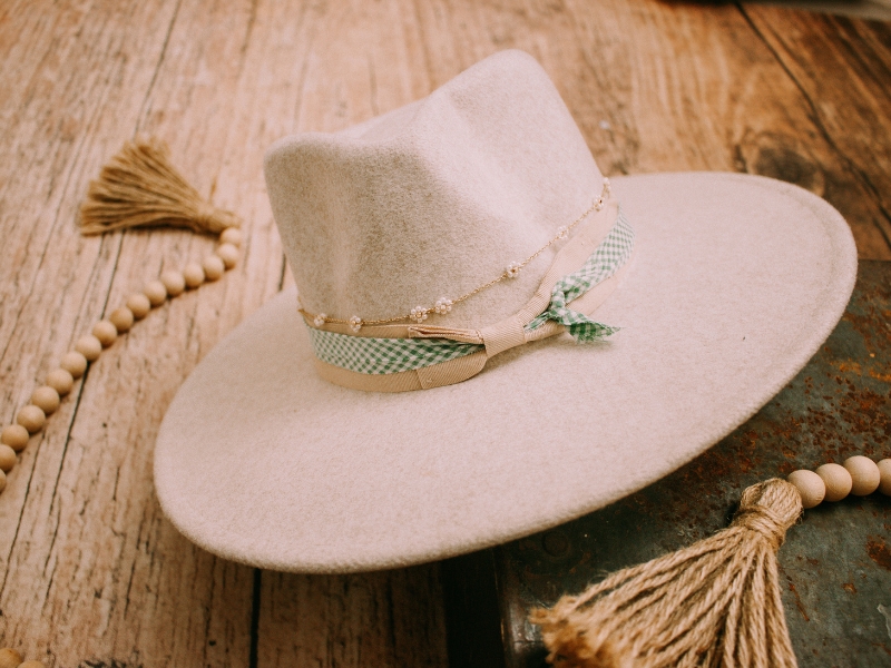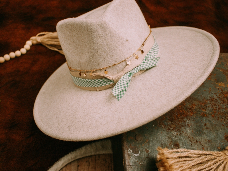 Add some Nashville to your outfit! In a mottled, light grey colour, this Nashville-inspired vegan felt wide brim hat is the perfect finish to your western outfit. Featuring a structured, stiff brim, custom trim and fun charms.