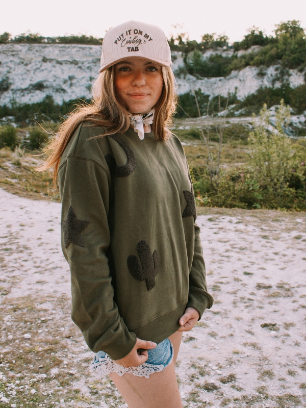 OLIVE WESTERN TEXTURED PATCH SWEATSHIRT